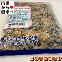 原材料名:塩かずの子(ニシンの卵(ロシア又はアメリカ又はカナダ又はデンマーク又はノルウェー)、食塩)、発酵調味料、昆布、還元水飴、しょう油、人参、するめ、砂糖、かつお節エキス、唐辛子、昆布抽出物、食塩、醸造酢/調味料(アミノ酸等)、酒精、酸味料、増粘剤(キサンタンガム)、保存料(ソルビン酸K)、(一部に小麦・いか・大豆を含む)